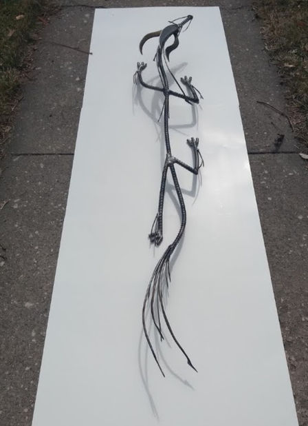 This little lizard guy was my first attempt at form and motion art. Having a career in metal fabrication, I knew how to work the metal, but this piece was one of several that allowed me to work metal and try techniques that I had never done in my profession. I had a lot of fun with this project, and look forward to creating more motion pieces. He is made from #8 rebar and cold rolled rod.